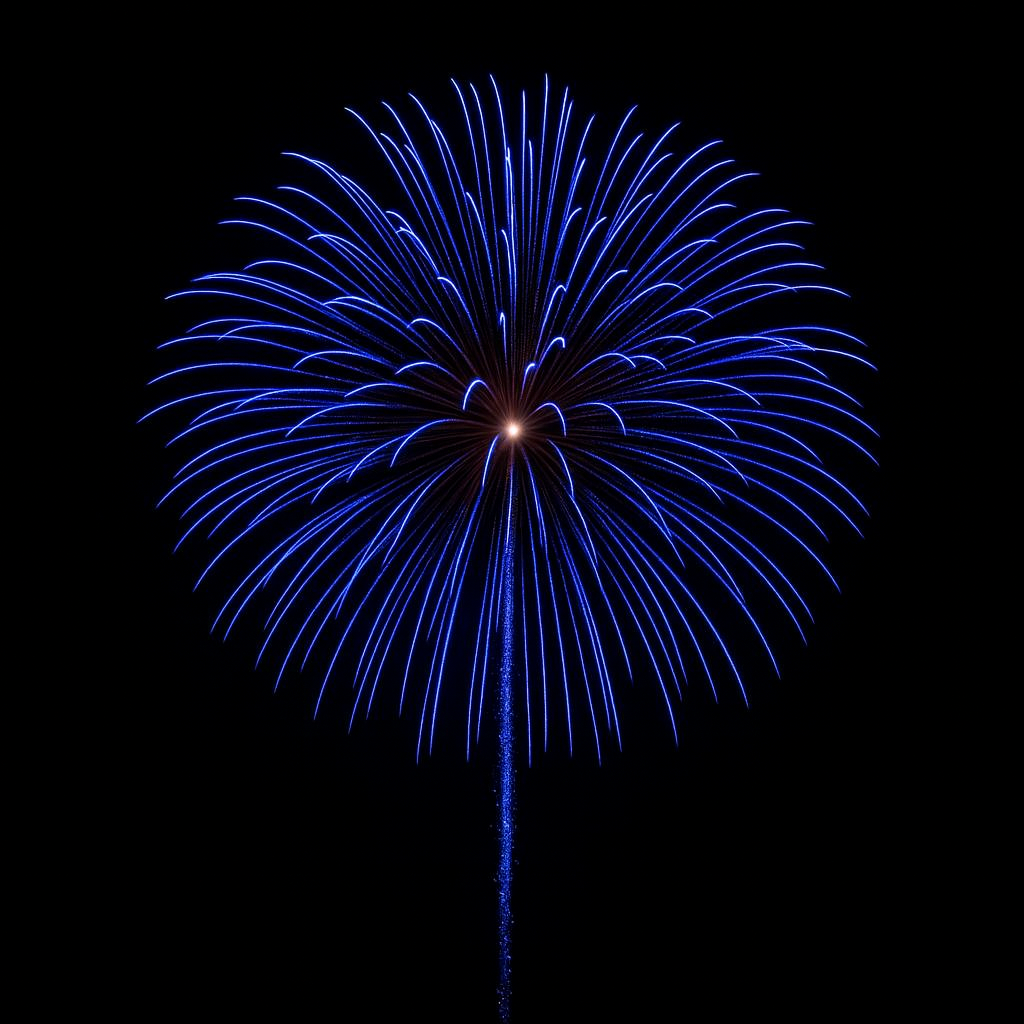 - Effect: Chrysanthemum — a spherical break of vivid blue stars with visible spark trails, creating a full-bodied, petal-like burst